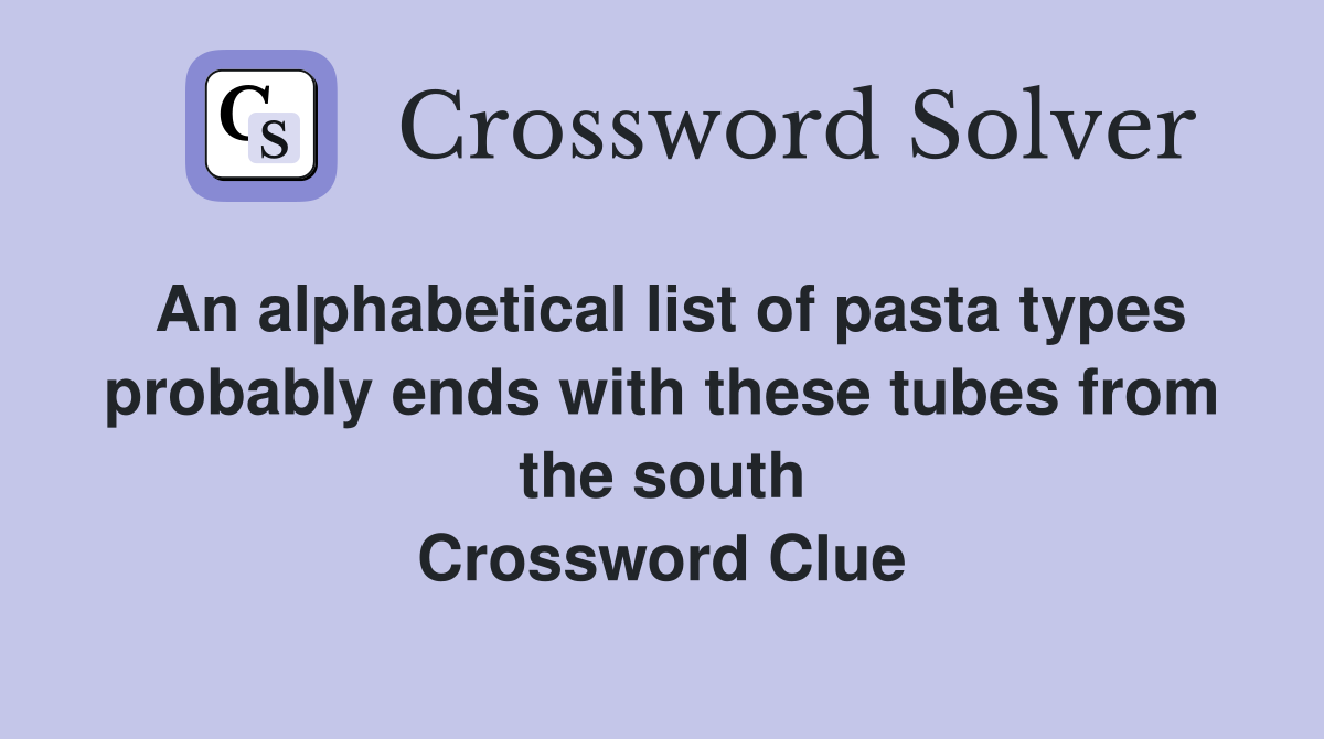 An alphabetical list of pasta types probably ends with these tubes from Pasta Tubes Crossword Clue Dan Word We will try to find the right answer to this particular crossword clue. The crossword solver found 30 answers to pasta tubes, 4 letters crossword clue. Web here is the answer for the crossword clue pasta tubes last seen in sun two speed puzzle. Web today's crossword puzzle clue is a quick one: Pasta tubes we have 4 answers for. Pasta Tubes Crossword Clue Dan Word.